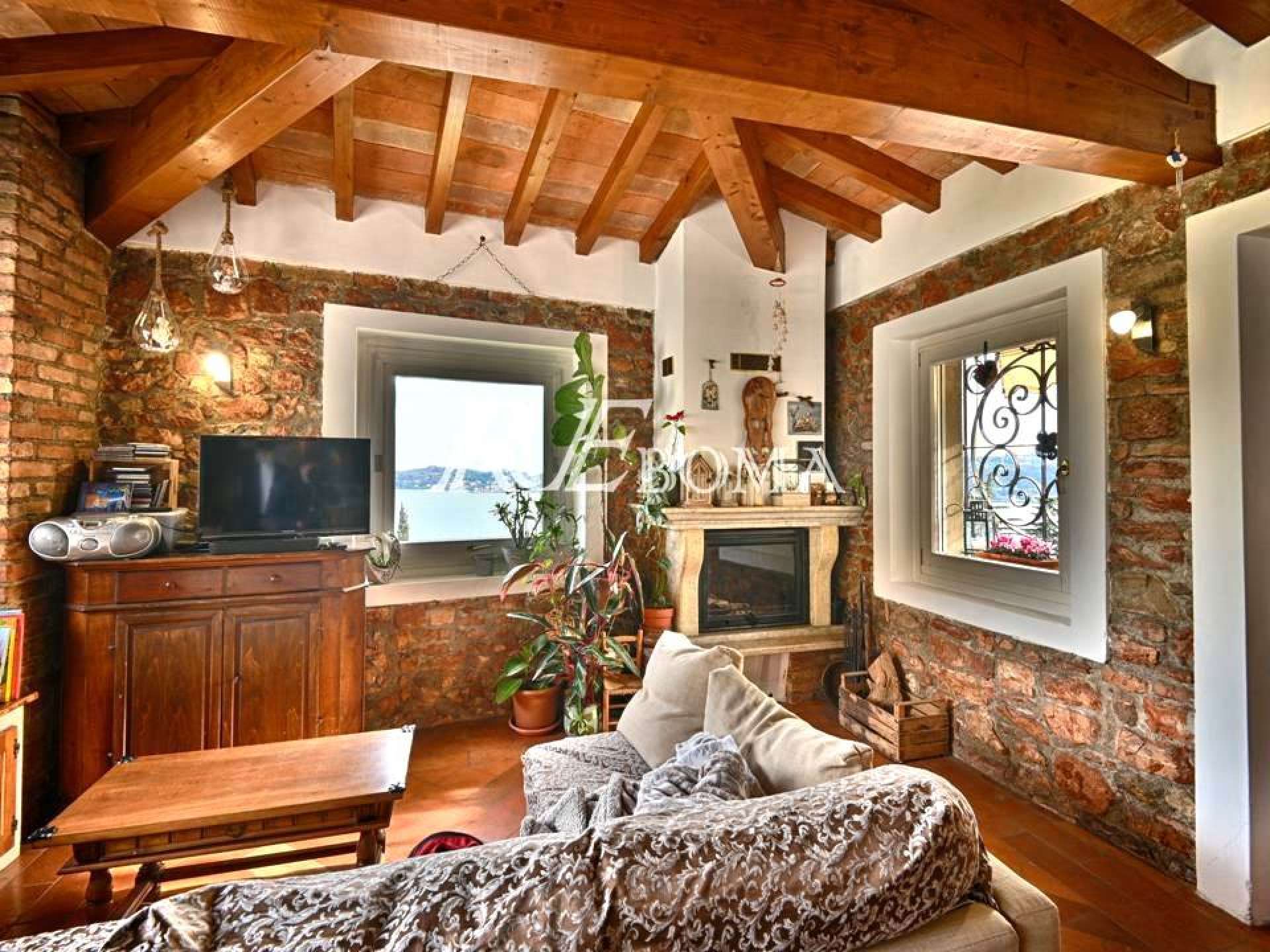 Im zweiten Stock liegt die herrschaftliche Wohnung, die sich durch große Fenster, einen Balkon mit Blick auf die Isola del Garda und einen prächtigen historischen Keramikofen auszeichnet.