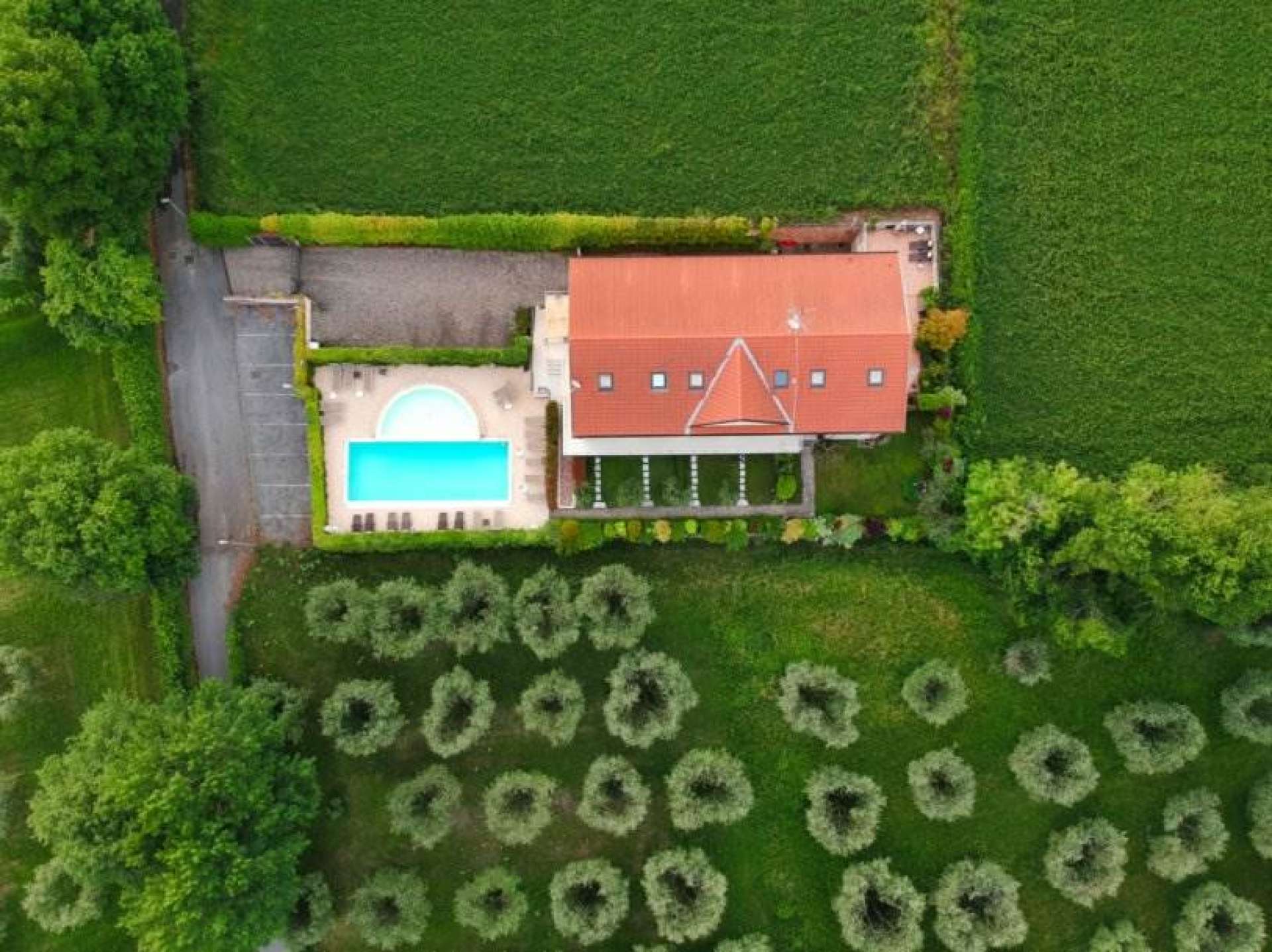 Das Anwesen umfasst Parkplätze, Garage, Schwimmbad und Grundstück.