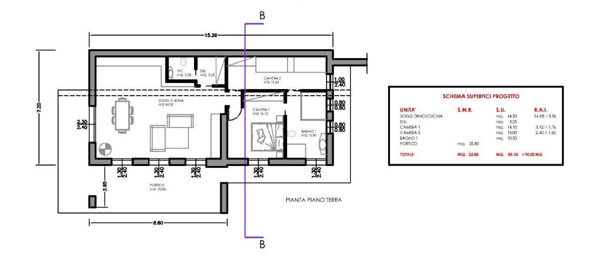 The planned home includes a bright open-plan living area with kitchen, two bedrooms, two bathrooms, and an outdoor porch perfect for enjoying the open air in complete peace.