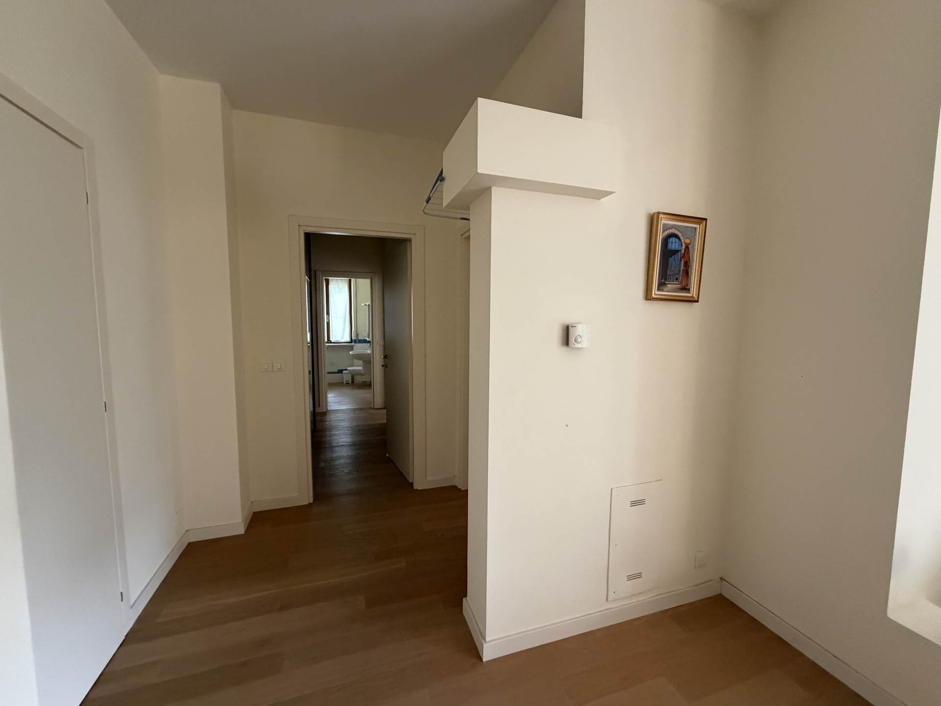 The sleeping area includes two bedrooms, one double and one single, connected by a corridor fitted with a large built-in wardrobe, ideal for maximizing storage.