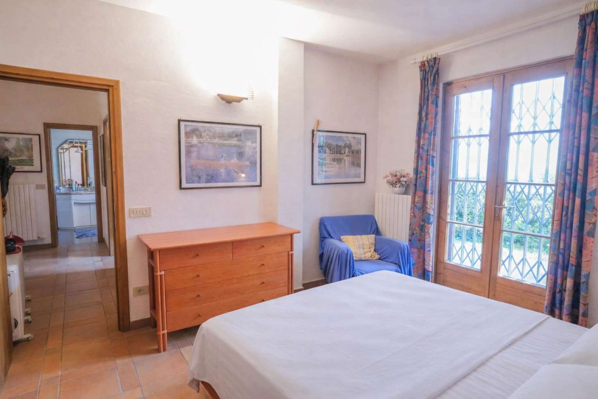 Distribuita su due livelli, la villa accoglie al piano superiore una luminosa zona giorno in stile