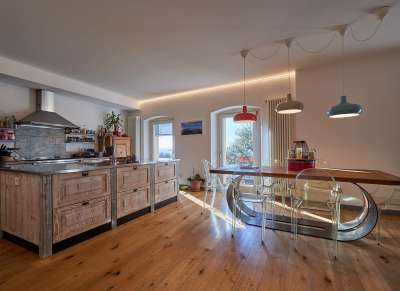 Dalla zona giorno si accede allo spazio esterno rappresentato da una bellissima terrazza con vista lago.