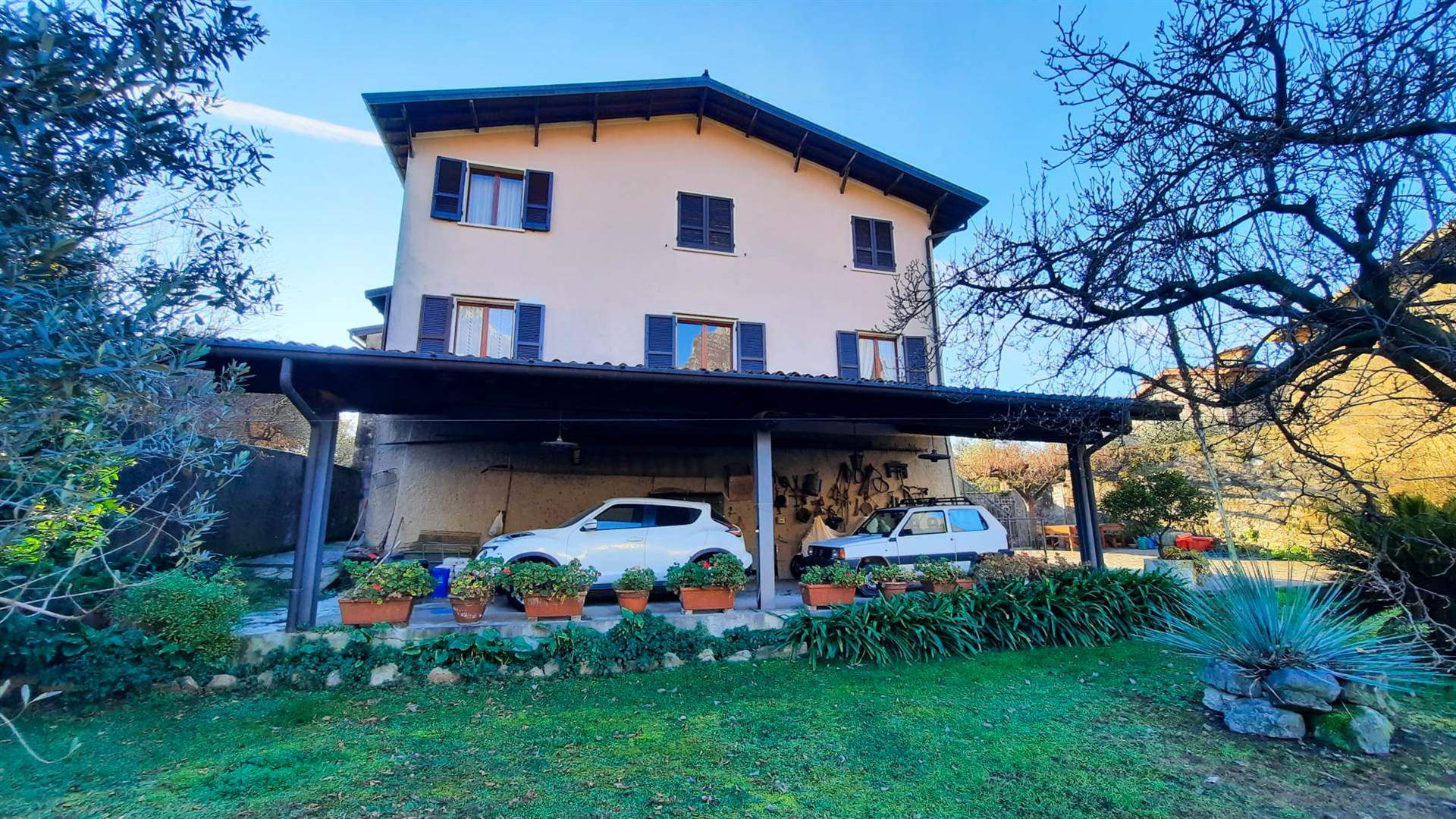 L'esterno è composto da una corte privata con tettoia per il parcheggio di almeno due auto.