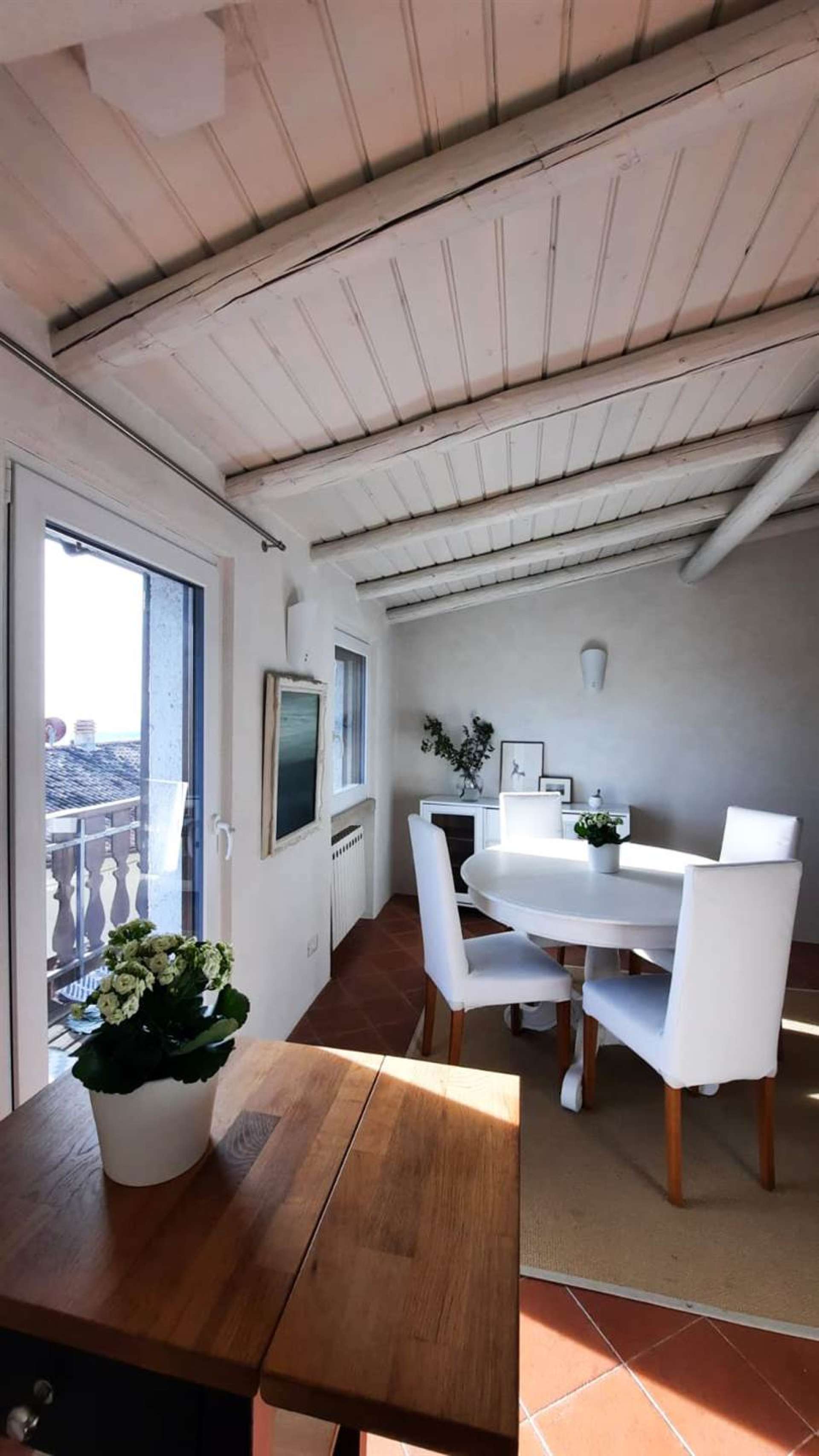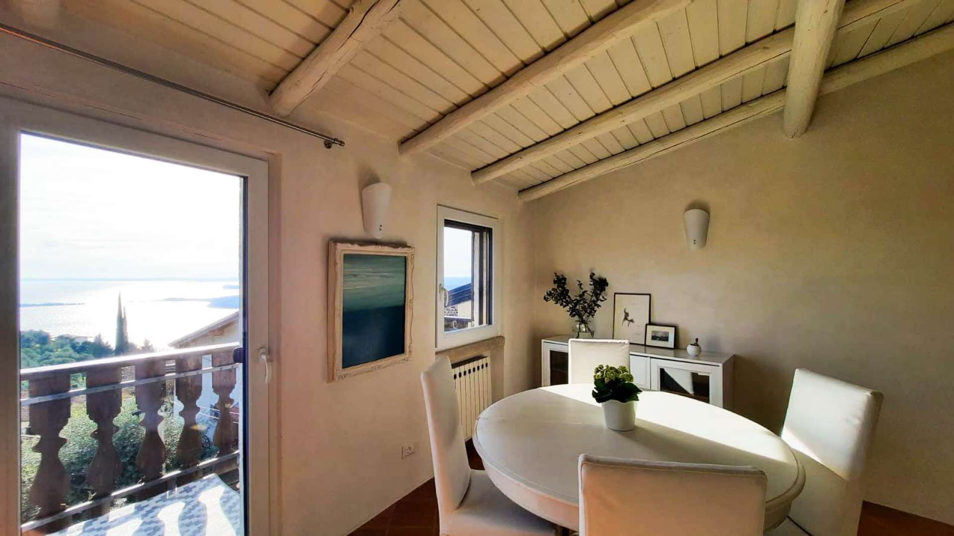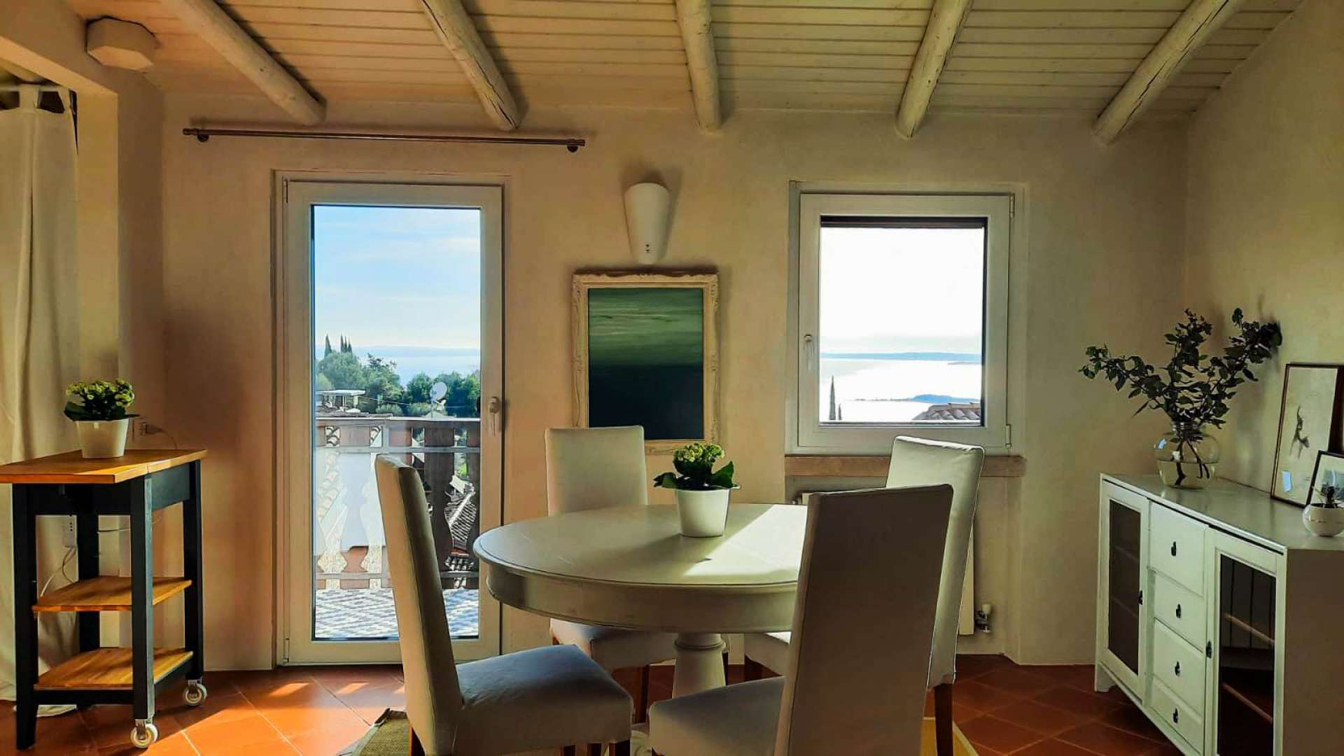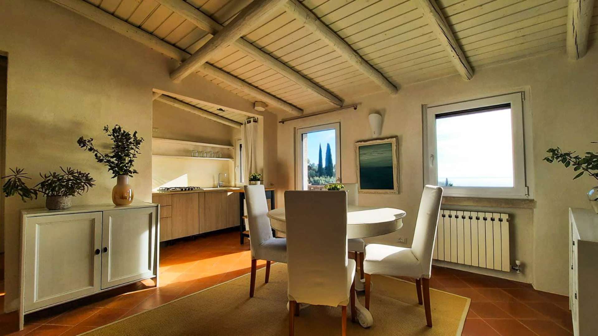 La zona giorno è luminosa e accogliente: il soggiorno, con angolo cottura a vista, gode di un accesso diretto alla balconata panoramica, dalla quale si apre una meravigliosa vista lago, percepibile già dall'interno.